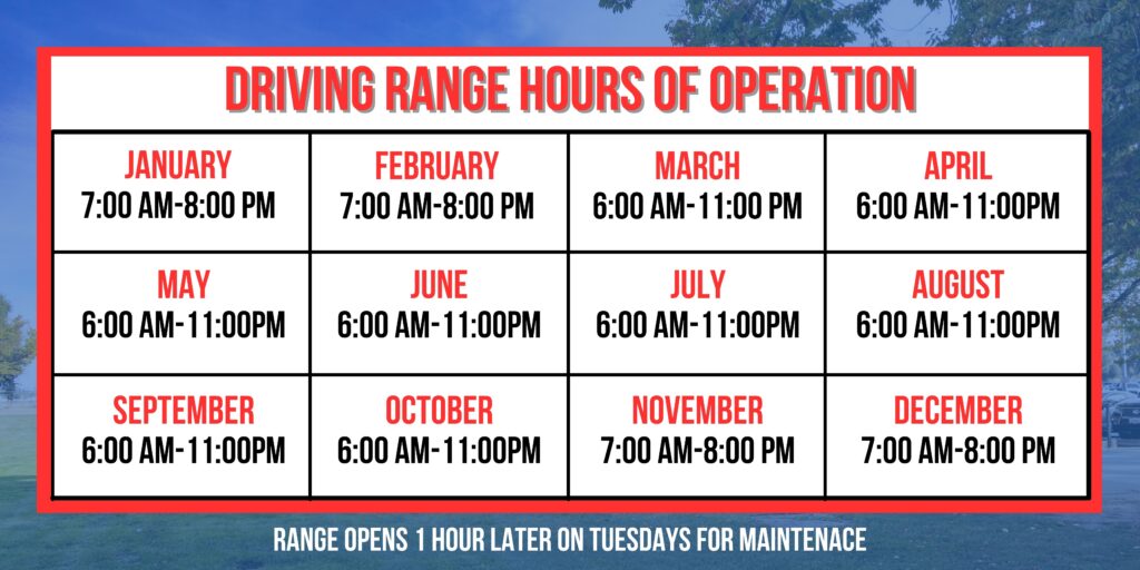 *The driving range opens an hour later on Tuesdays for maintenance.